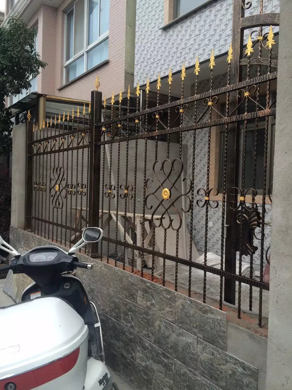圍欄由黑色金屬制成,設計非常精致,充滿了復雜的卷曲和花紋圖案,并且在一些關鍵部位有金色的裝飾,增添了一絲華麗感。圍欄的頂部有尖銳的裝飾性尖刺,顯得非常典雅。