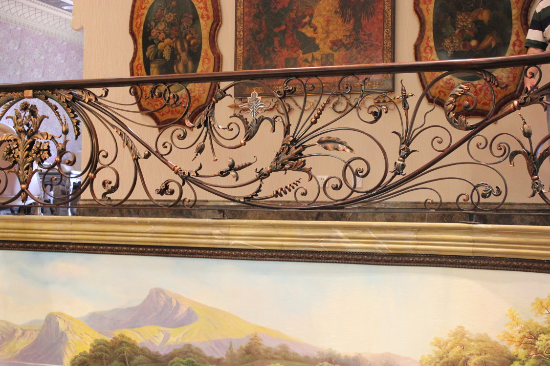 護(hù)欄的設(shè)計(jì)非常華麗,采用了復(fù)雜的卷曲花紋和裝飾圖案。欄桿的顏色為深棕色,帶有金色的裝飾細(xì)節(jié),增加了整體的豪華感。
