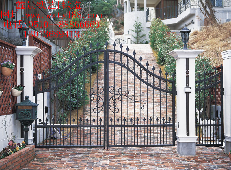 無錫鐵藝護欄廠專業(yè)鐵藝大門設計制作,有豐富的豪華大門,超級大門制作設計經(jīng)驗,本款大門典雅大氣,采用加粗實心鍛鋼制作,經(jīng)熱鍍鋅處理確保戶外風雨裸曬20年不脫漆,不生銹。